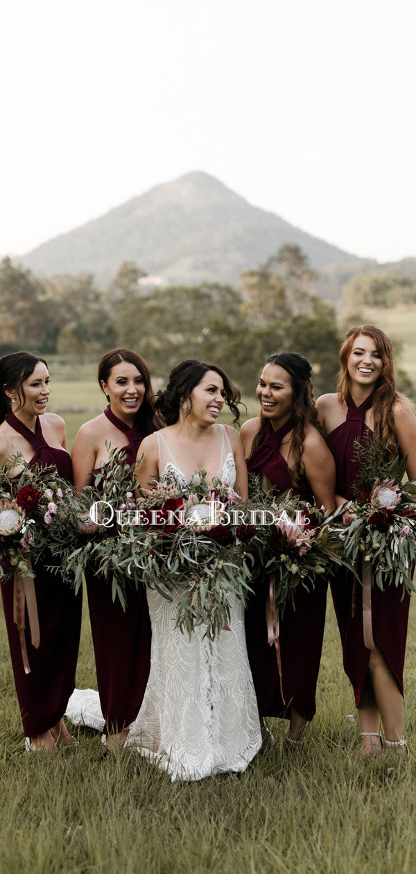 Sexy Halter Burgundy Side Slit Long Cheap Bridesmaid Dresses, BDS0099