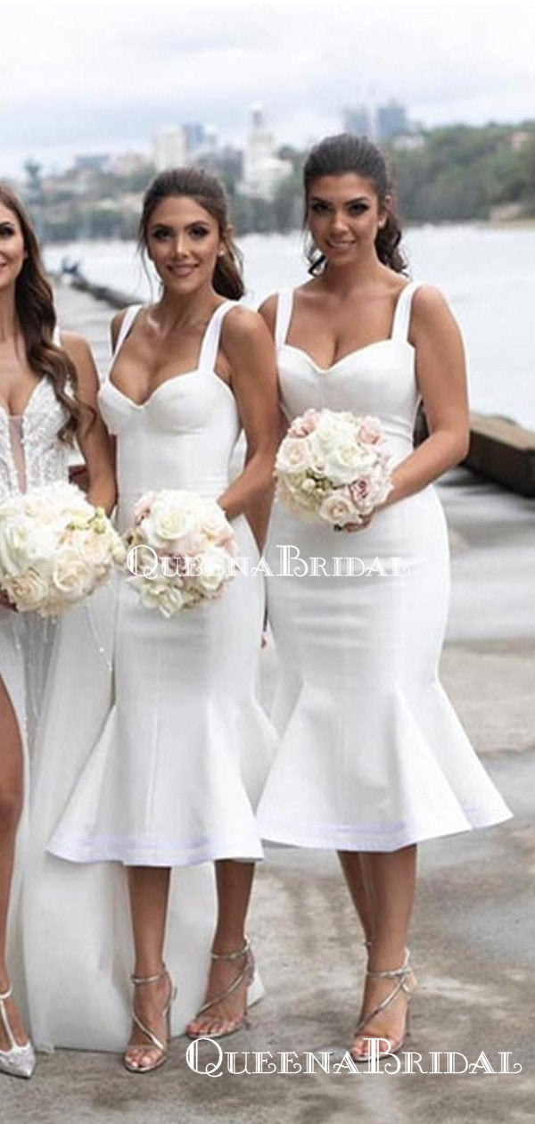 Square White Mermaid Tea-Length Cheap Bridesmaid Dresses, BDS0092