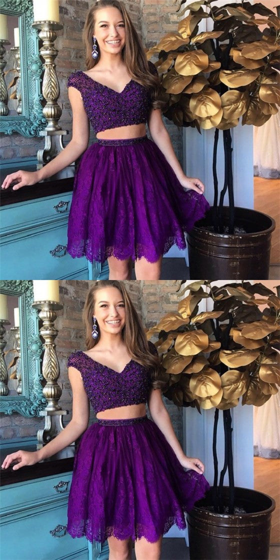 Two Piece V-Neck Beading Purple Short Cheap Homecoming Dresses with Lace, QB0183