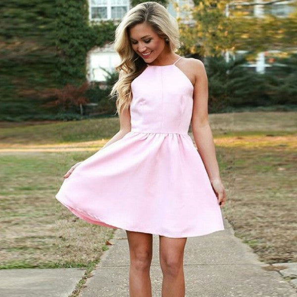 Simple Halter Strap Backless Short Cheap Pink Satin Homecoming Dresses, QB0184
