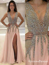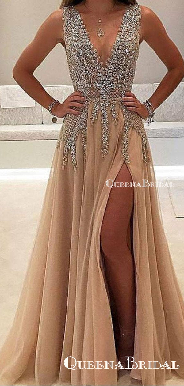 A-line V-neck Evening Dress with Slit Sexy Shiny Rhinestone Long Prom Dresses, QB0335