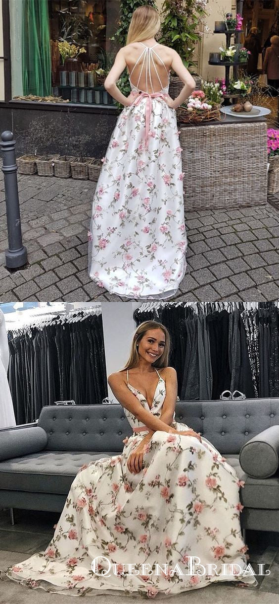 A Line V Neck Spaghetti Straps Flower Lace Long Prom Dresses, QB0586