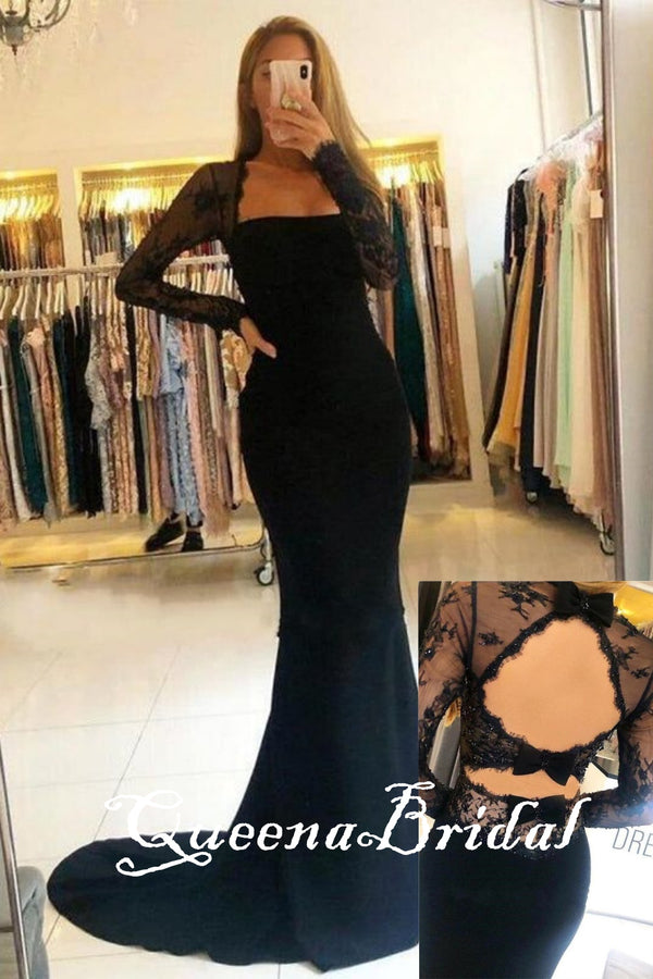 Black Long Sleeves Mermaid Appliques Straight Neck Evening Gown Maxi Long Evening Party Prom Dresses with Trailing,WGP1081