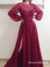 Burgundy Round Neck Heavy Beaded Long Tulle Prom Dresses, QB0558