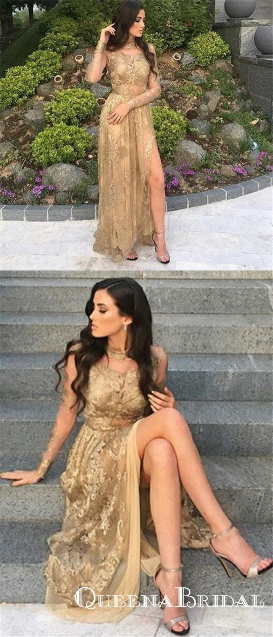 Charming A-Line High Neck Gold Lace Prom Dresses with Appliques, QB0578