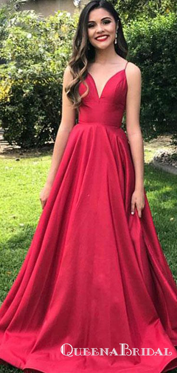 Charming A Line Spaghetti Straps Red Satin Long Prom Dresses, QB0636