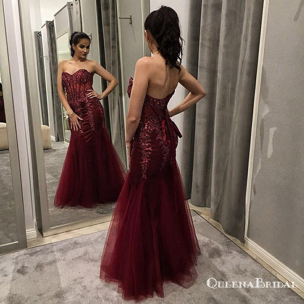 Charming Mermaid Sweetheart Long Burgundy Prom Dresses with Appliques, QB0527