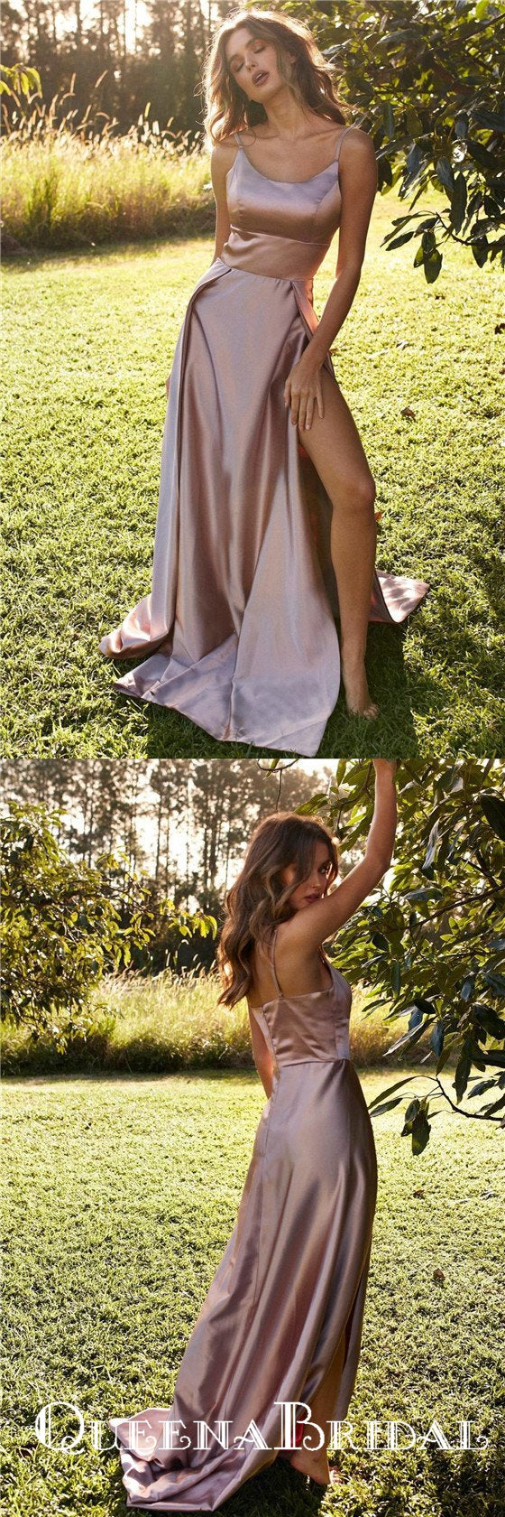 Dusty pink Spaghetti Strap Long Cheap Slit Prom Dresses, QB0556