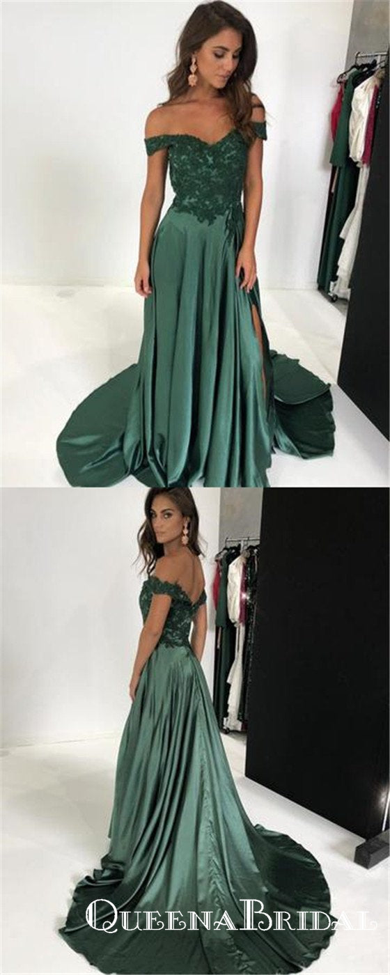Elegant Green Lace V-neck Off-the-shoulder Long Satin Split Prom Dresses, QB0597