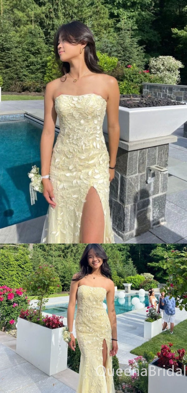 Light Yellow Sheath Straight Neck Leaf Appliques Strapless Evening Gown Maxi Long Evening Party Prom Dresses with Side Slit ,WGP1000