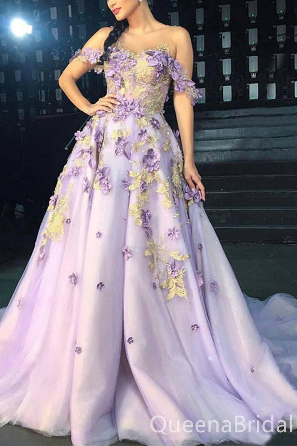 Lilac Flower Appliques A-line Off-the-shoulder Evening Gown Long Evening Party Prom Dresses,WGP1233