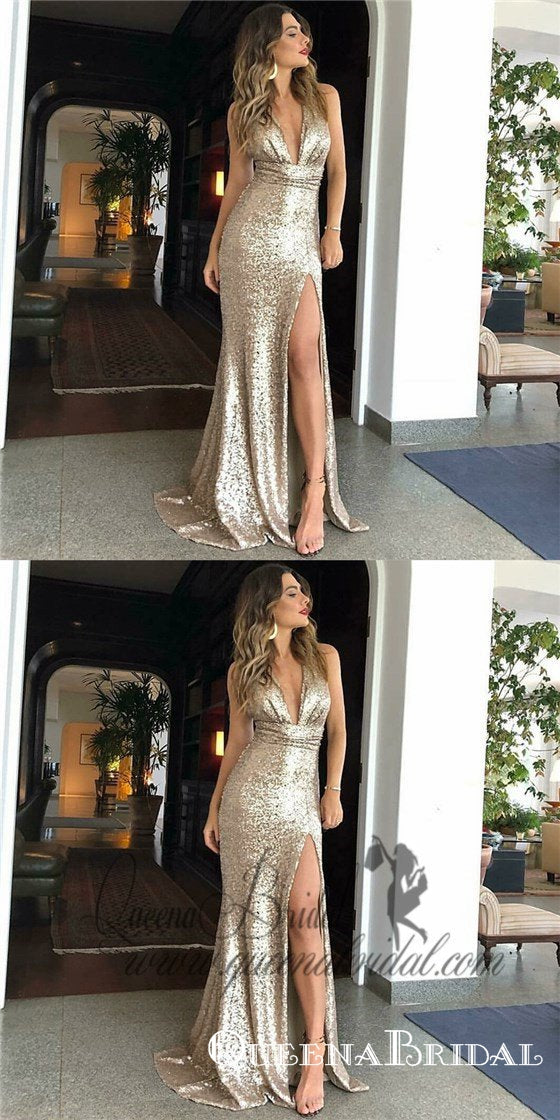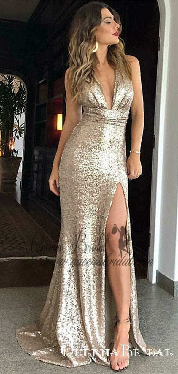 Mermaid Deep V-Neck Long Champagne Sequined Split Prom Dresses, QB0491