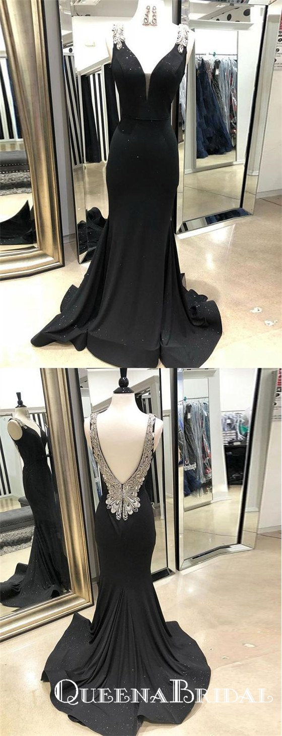 Mermaid V Neck Black Long Mermaid Prom Dresses With Beaded, QB0634