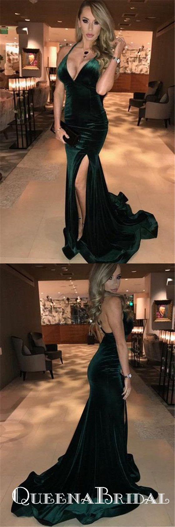 Mermaid V Neck Open Back Dark Green Velvet Long Prom Dresses, QB0589