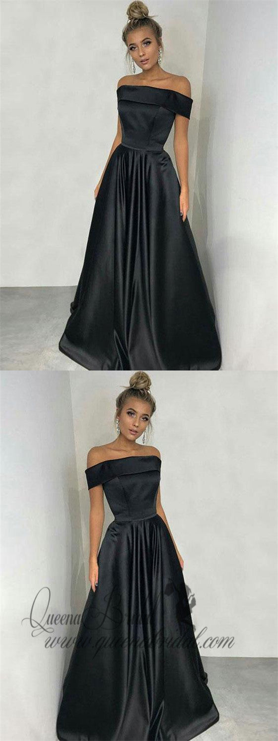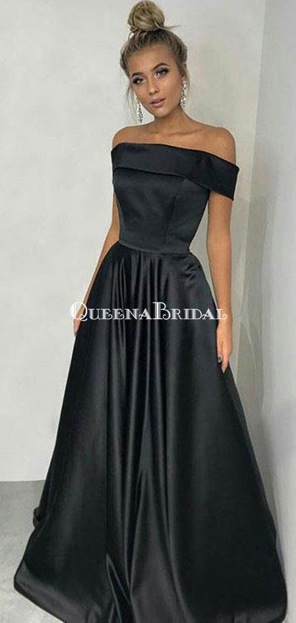 Princess Off the Shoulder Black Satin Long Simple Prom Dresses, QB0347
