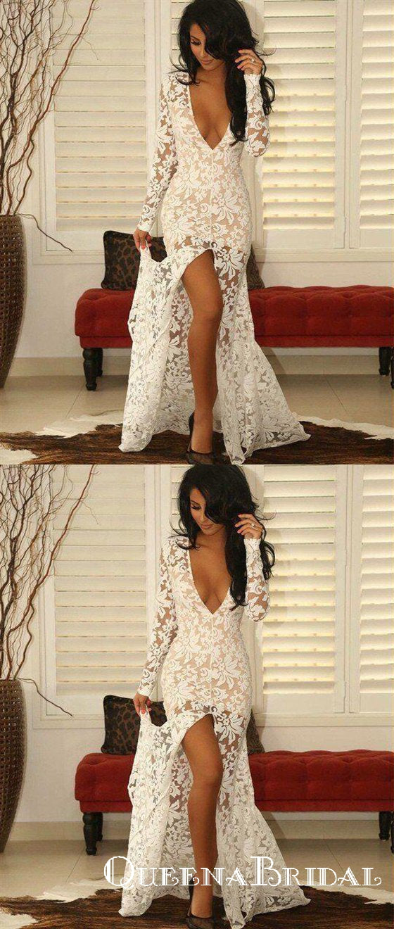 Sexy Lace V-neck Long Sleeve Mermaid Split Front Prom Dresses, QB0700