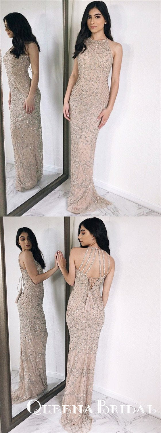 Sheath Round Neck Light Champagne Prom Dresses with Sequins, QB0559