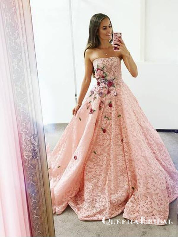 Strapless Pink Lace Long Ball Gown with Floral Embroidery Prom Dresses, QB0602