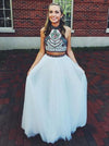 Two Piece Halter Embroidered Boho Prom Dresses White A Line Long Formal Dresses, QB0293