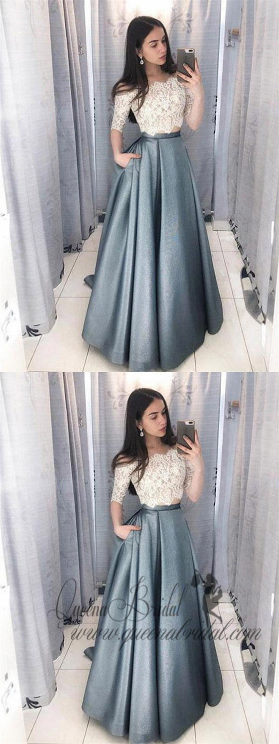 Two Pieces Half Sleeve Lace Grey Long Evening Prom Dresses, QB0421