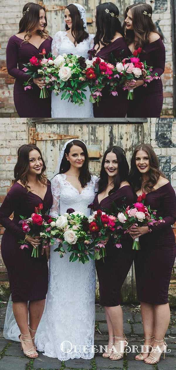 Sheath V-Neck Long Sleeves Grape Short Jersey Bridesmaid Dresses, QB06