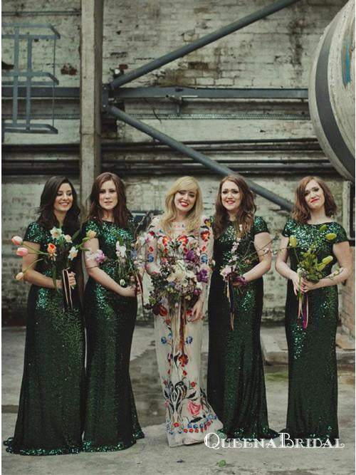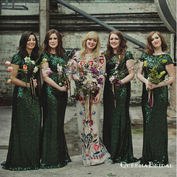 Mermaid Bateau Long Cheap Green Sequin Bridesmaid Dresses, QB0749