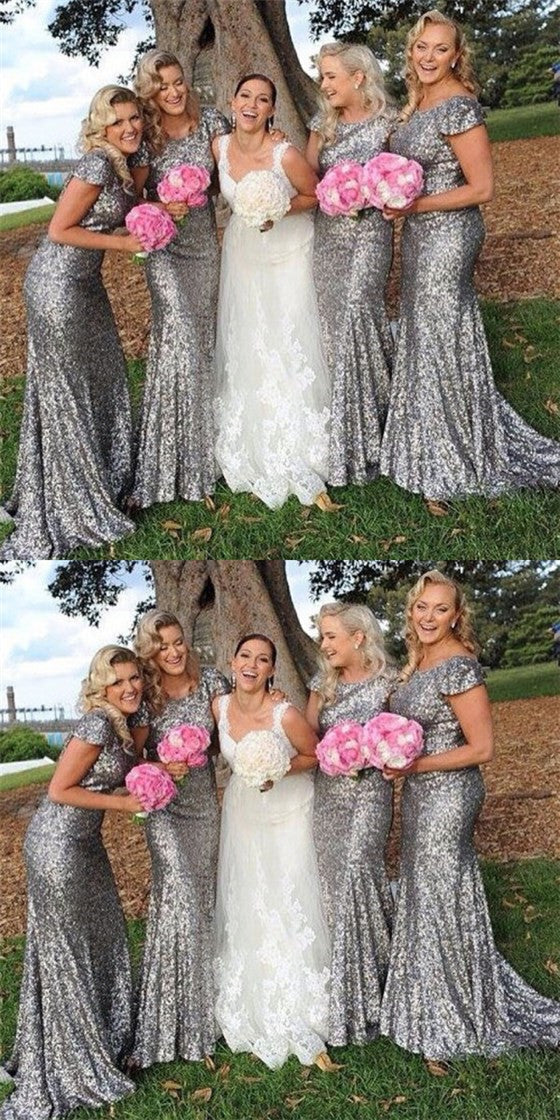 Mermaid Round Neck Cap Sleeve Long Cheap Silver Sequin Bridesmaid Dresses Online, QB0161