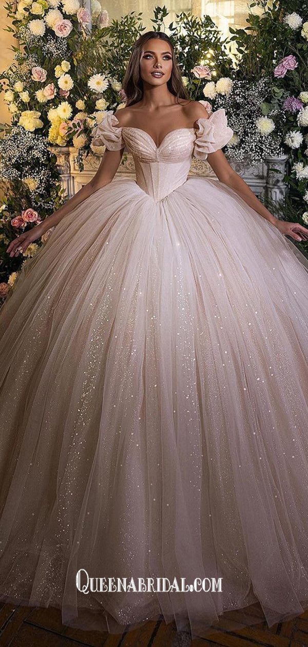 Courtly Style Puff Sleeve Pleating Sequins Tulle Ball Gown Wedding Dresses Prom Dresses, WGP214
