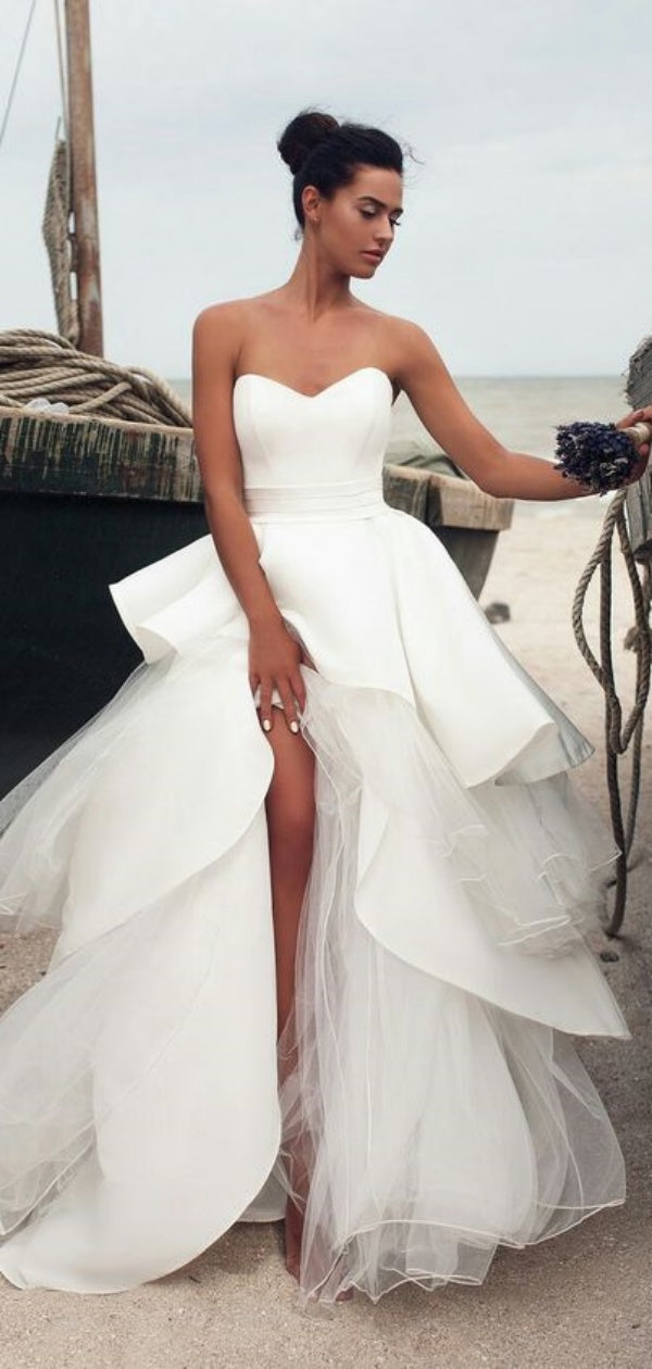 Elegant White Sleeveless Strapless Tulle Sweetheart Side Slit A-Line Long Wedding Dresses,WGP219