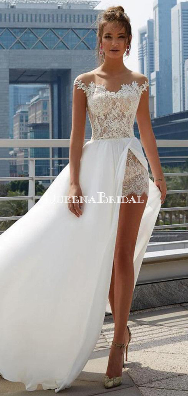 Off Shoulder See Through Cheap Wedding Dresses Online, Side Slit A-line Bridal Dresses, QB0383