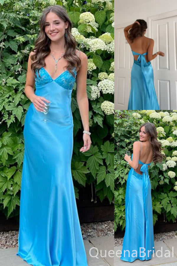 Blue Spaghetti Straps Sheath Evening Gown Maxi Long Evening Party Prom Dresses ,WGP1151
