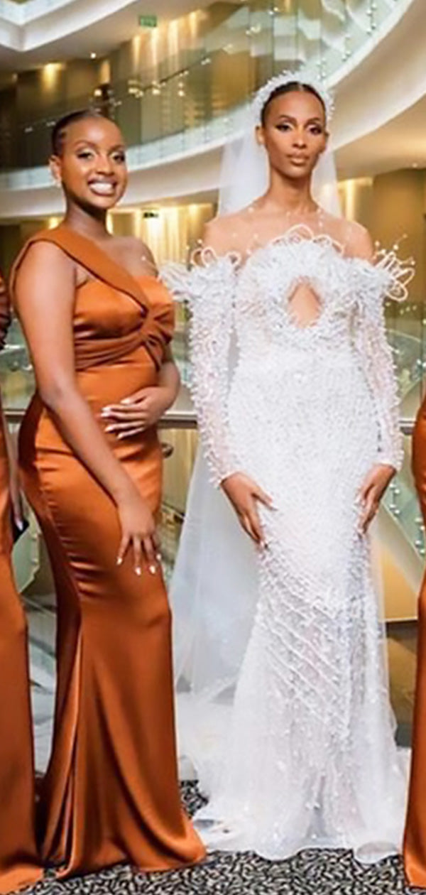 Elegant Orange Off Shoulder Pleats Simple Cheap Mermaid Long Bridesmaid Dresses, BDS0200