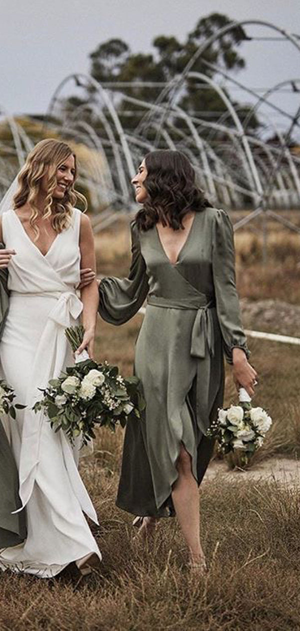 Long Sleeves V-neck Green Tea Length Cheap Bridesmaid Dresses, BDS0116
